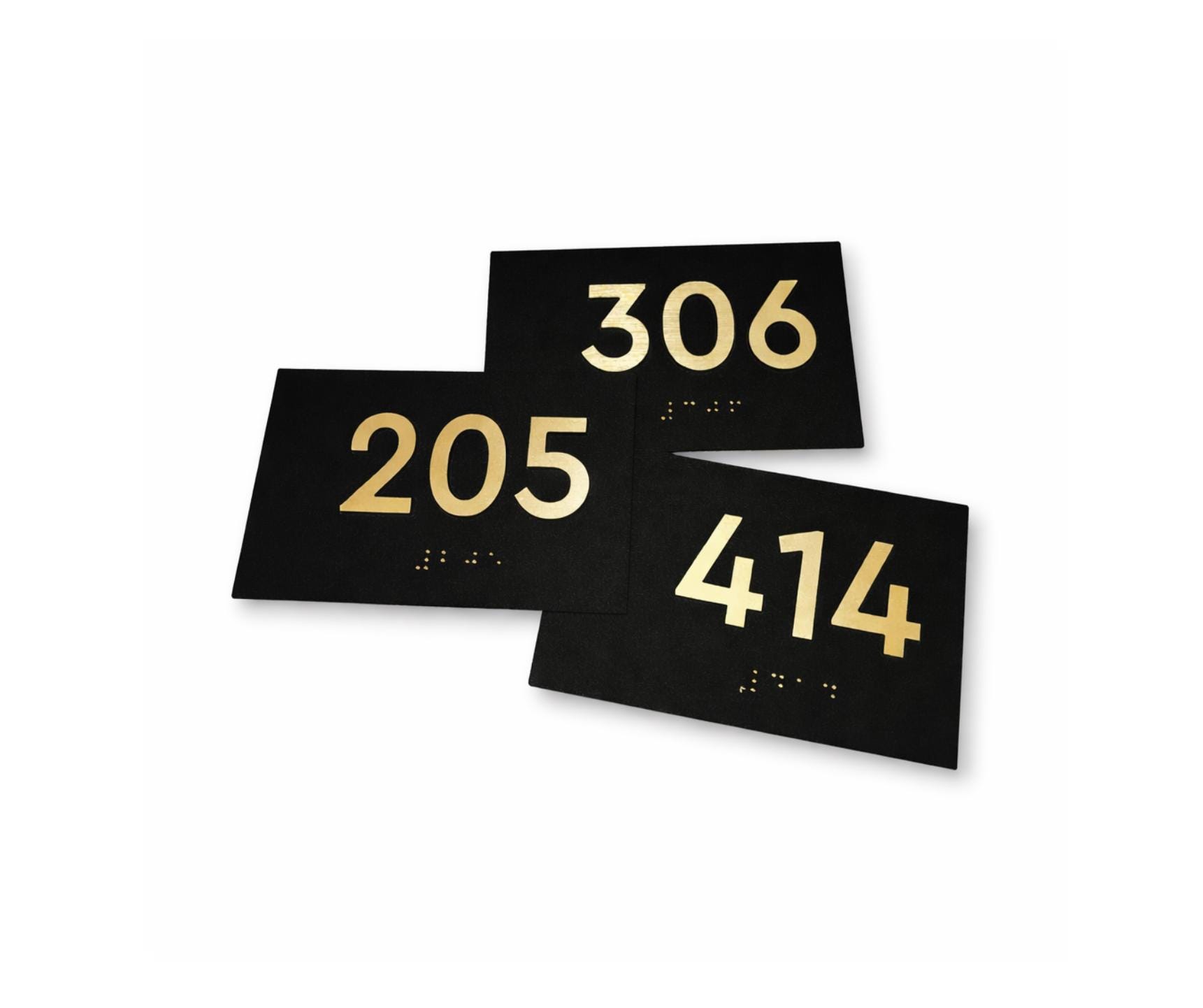 Custom ADA compliant room number signs with sleek and modern design. Ideal for numbering of hotel rooms, apartment doors, exam rooms, offices and many more.