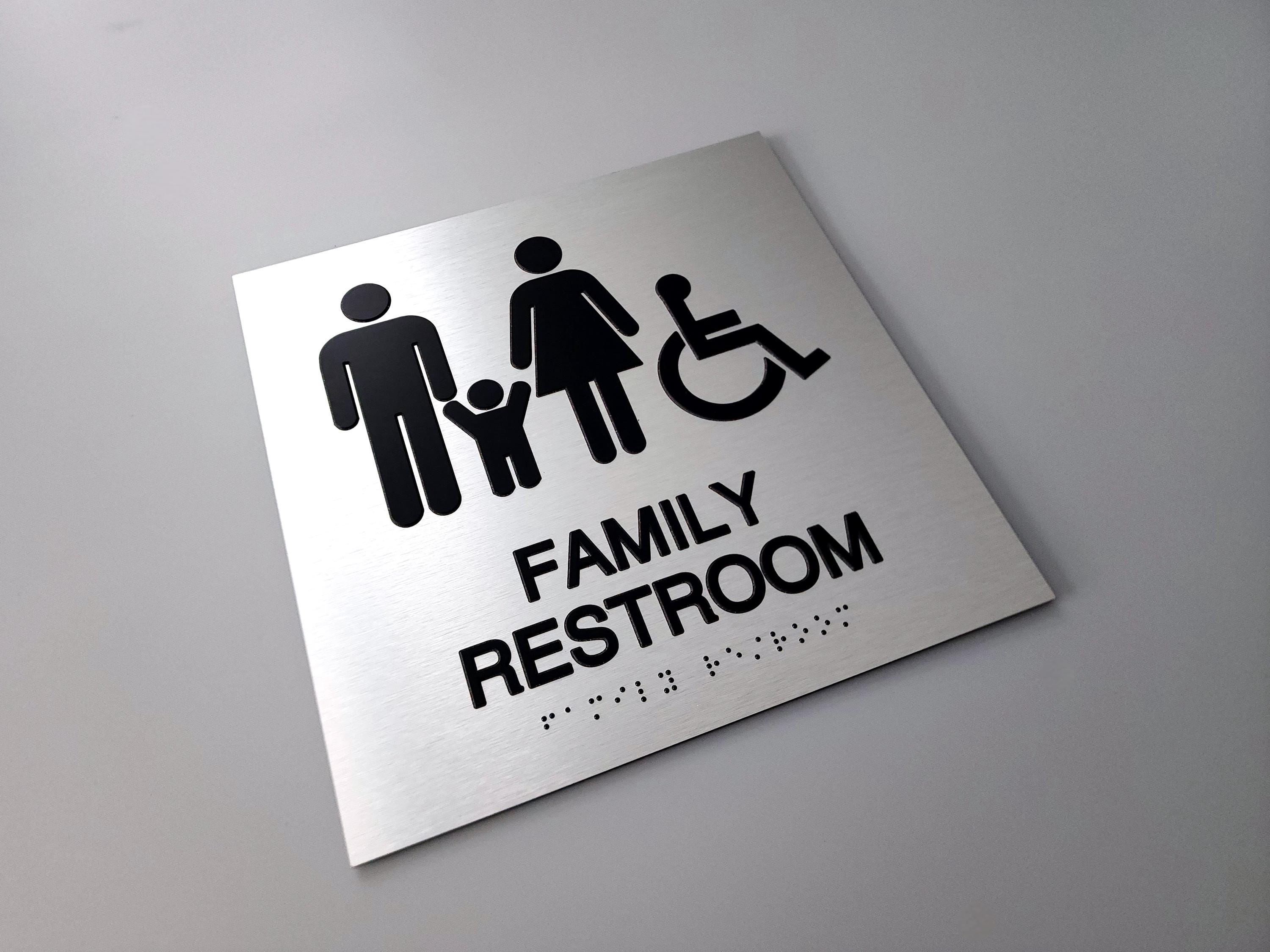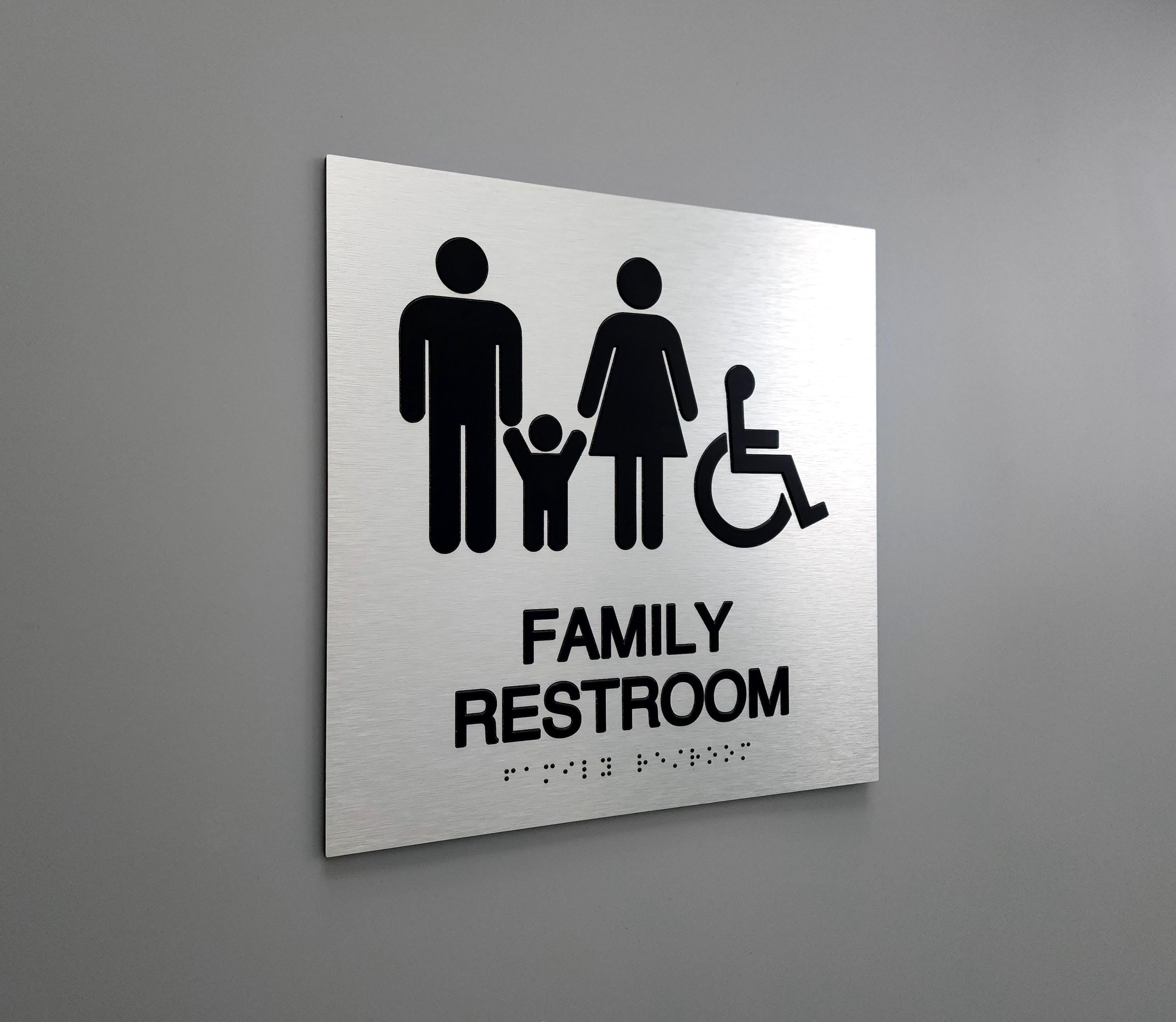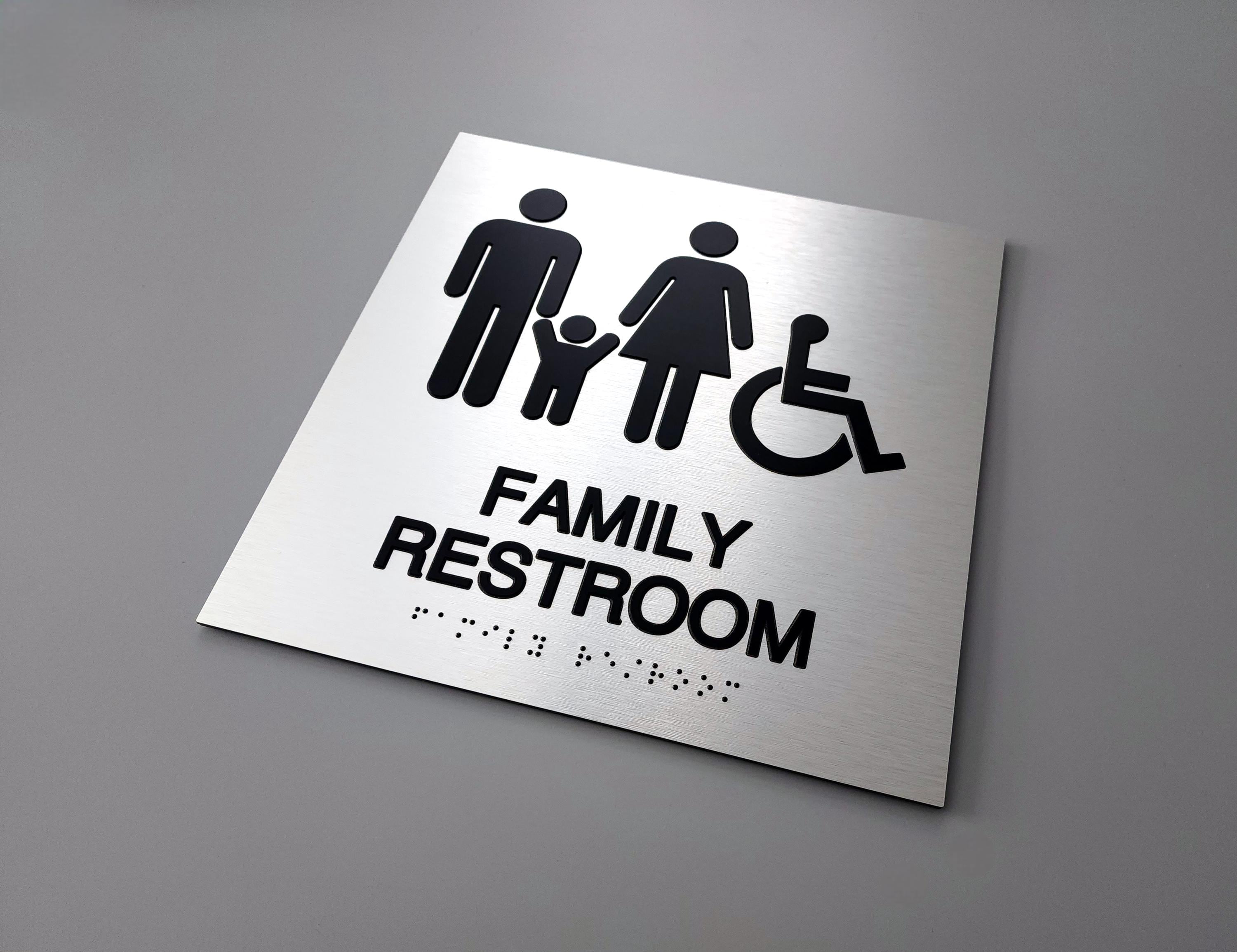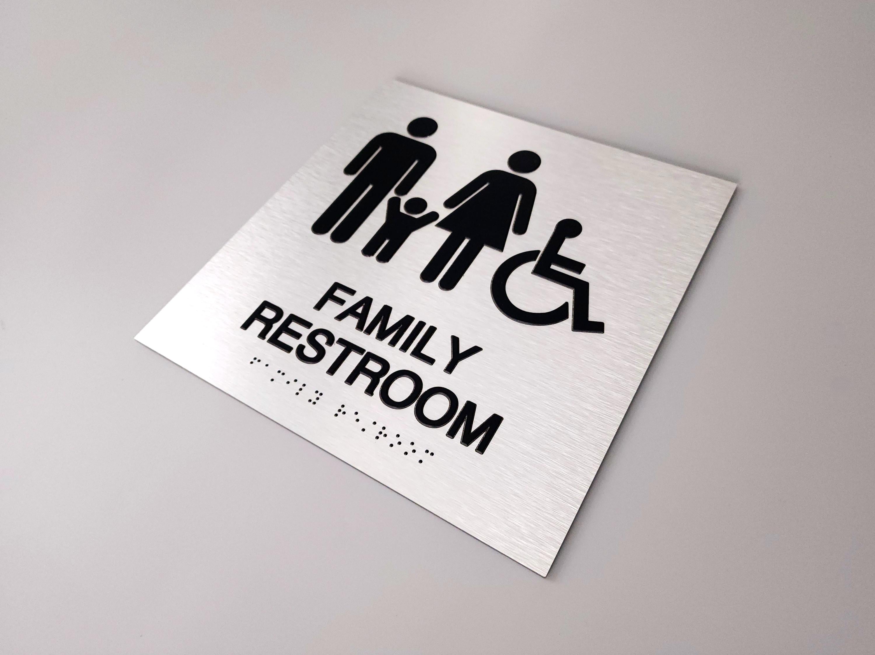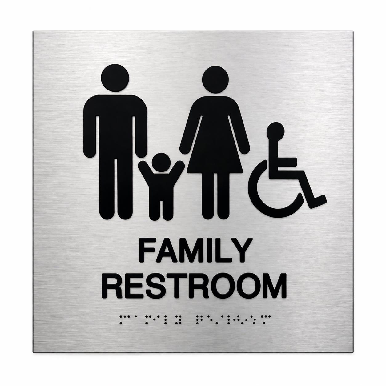Elevate your space with this modern, sleek ADA-compliant family restroom sign, designed to blend accessibility with refined style. Its clean lines and minimalist square design create a professional, high-end look perfect for offices, retail spaces, and contemporary interiors. Crafted for both function and aesthetics, this sign delivers clear visibility while complementing your space with a polished, sophisticated finish.