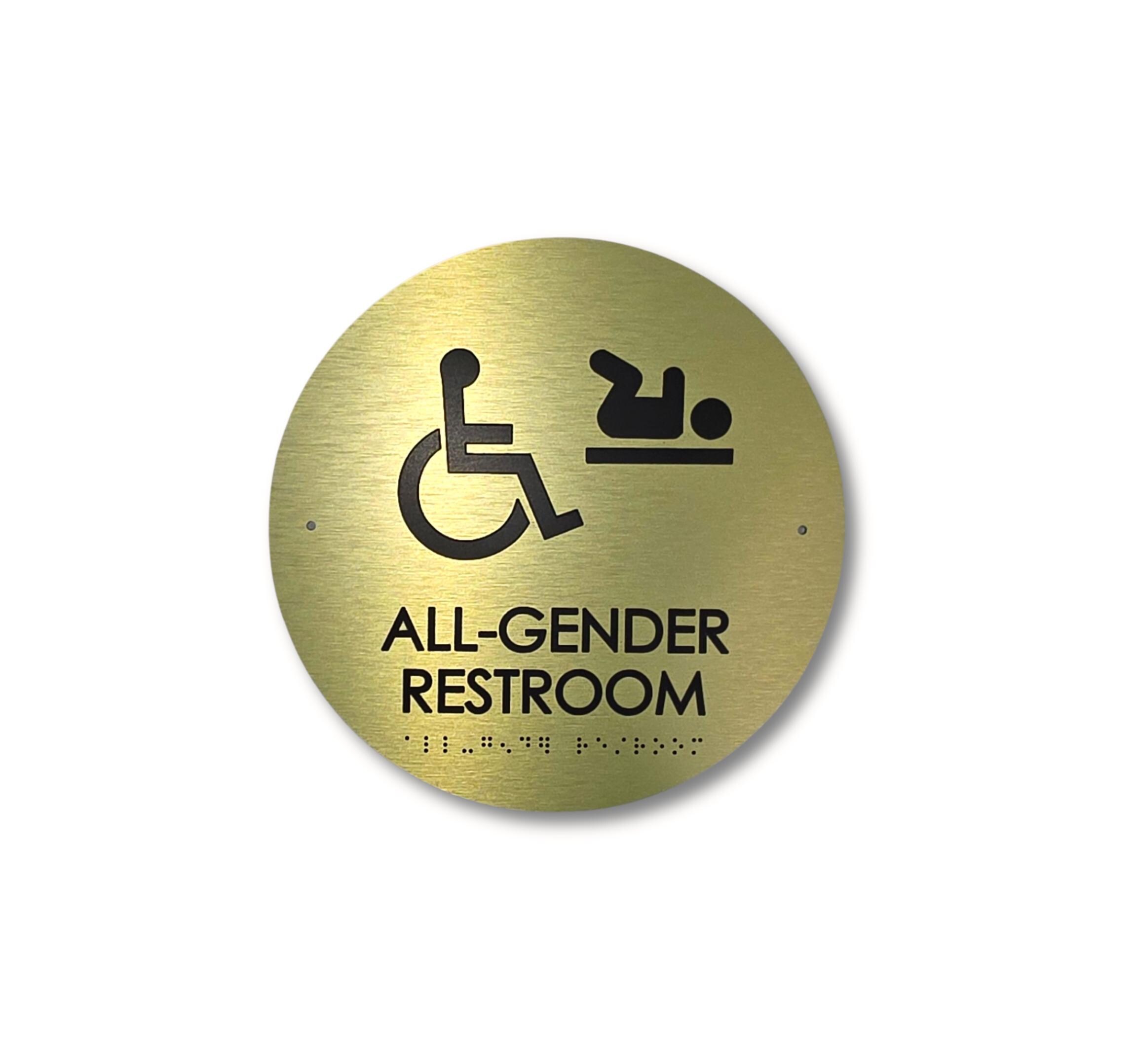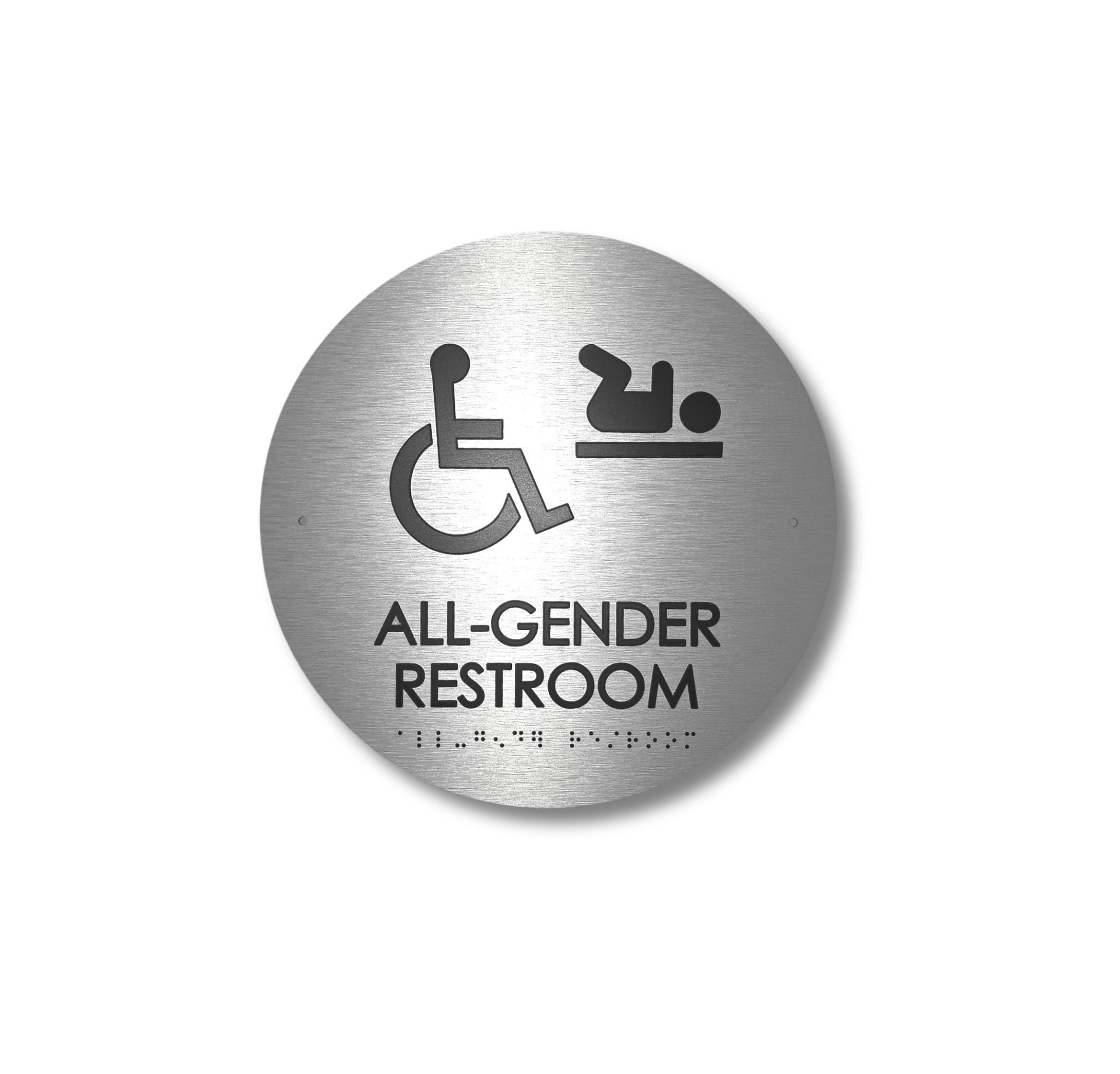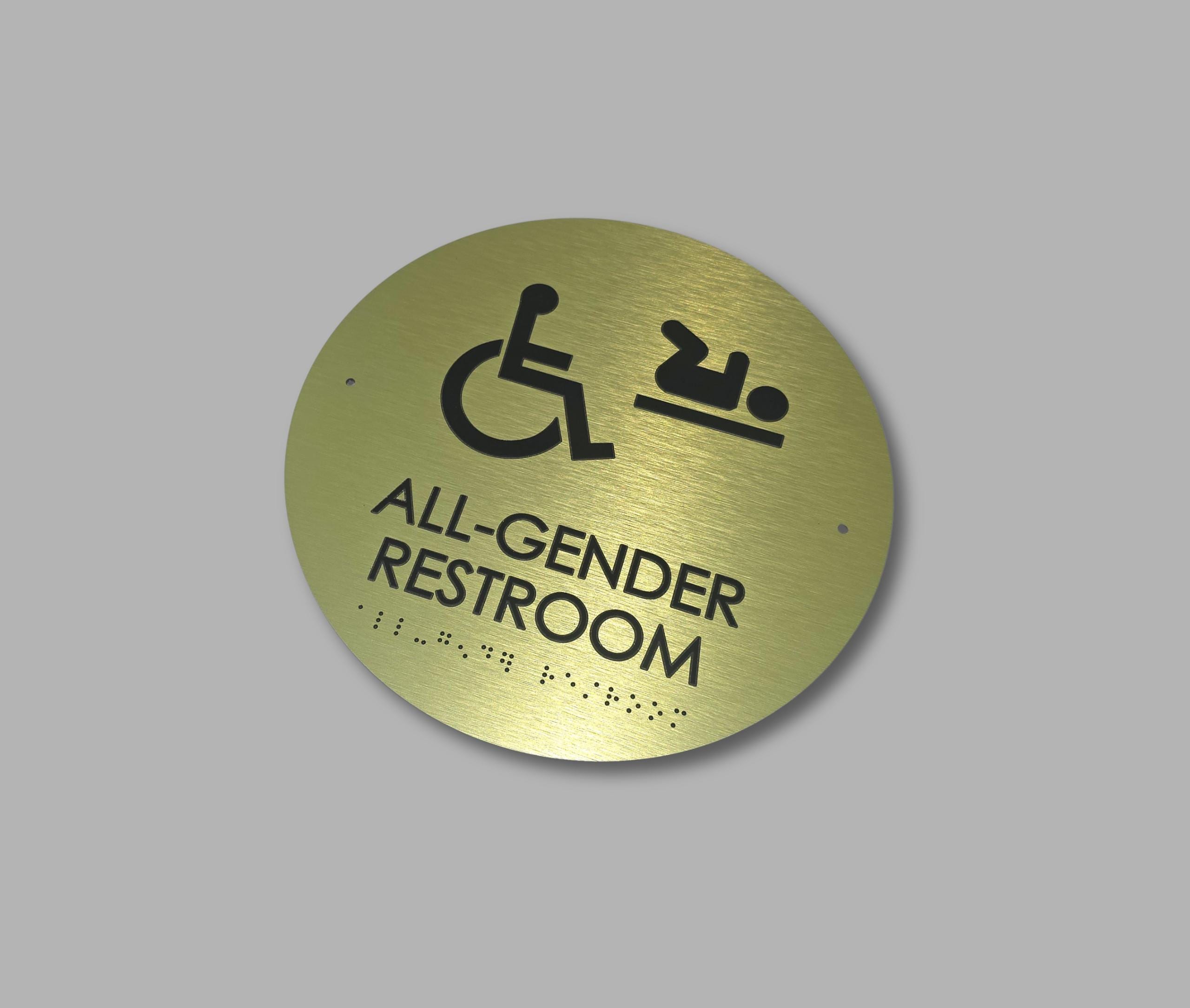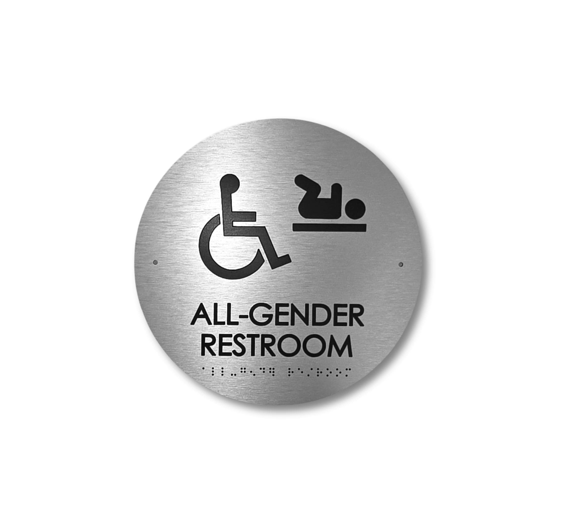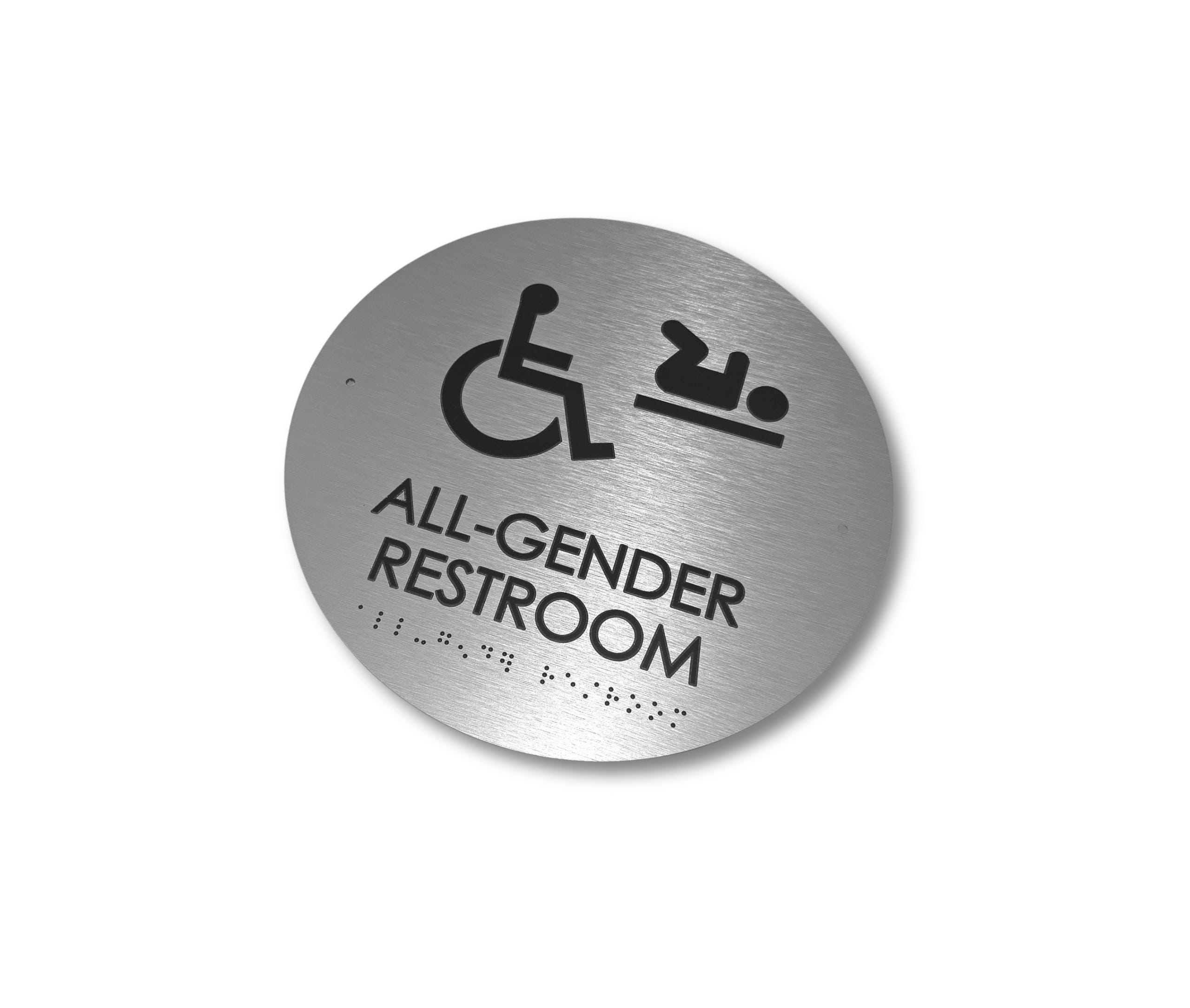 This modern all-gender restroom sign features a sleek design with clear accessibility and baby changing symbols, creating a clean and inclusive look for any space. Designed with ADA compliance in mind, it includes tactile lettering and Braille for accessibility. Perfect for offices, restaurants, retail spaces, and public facilities looking for a professional and contemporary signage solution.